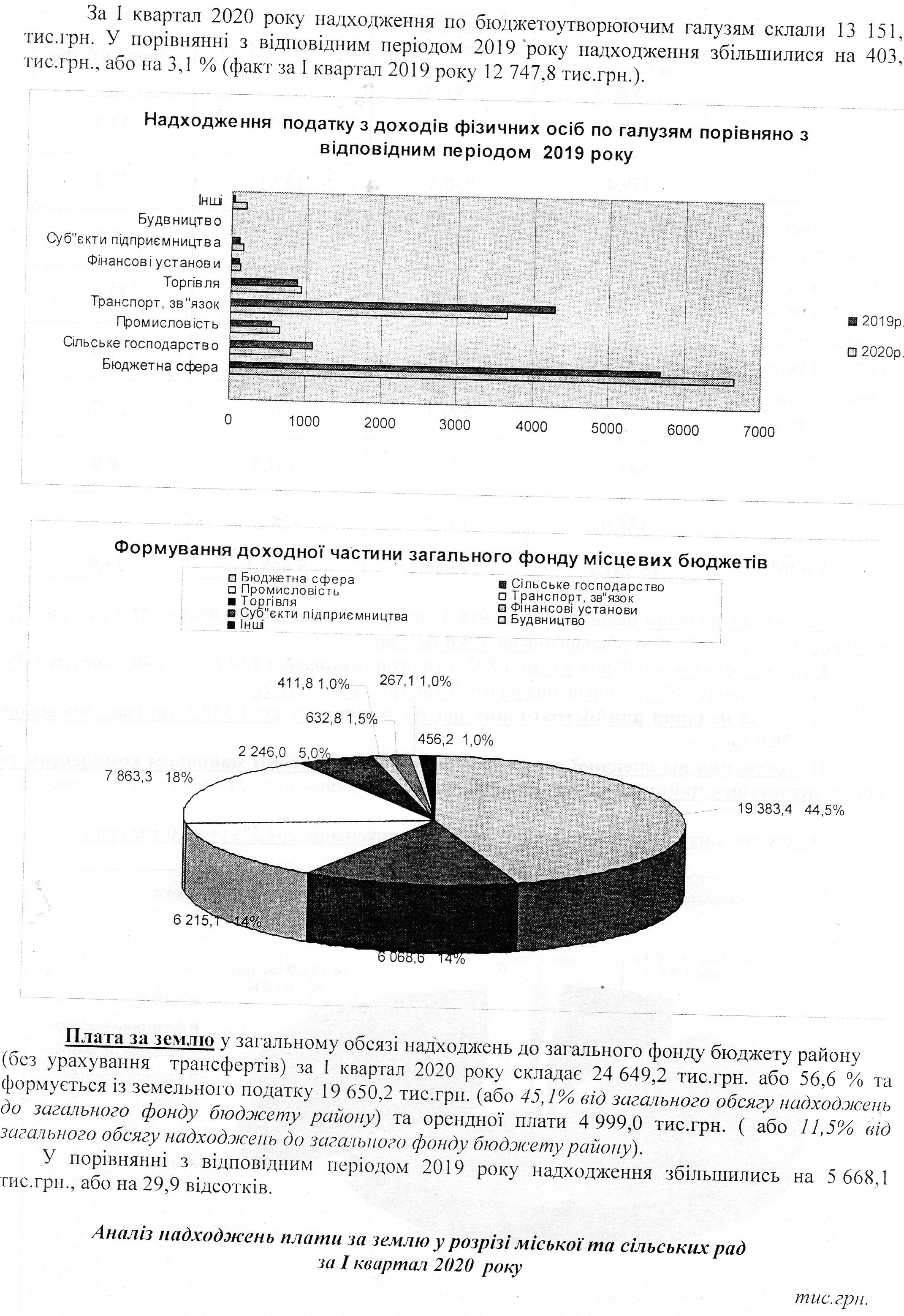 Сведения о собственных «заработках» районного бюджета можно почерпнуть из пояснительной записки, приложенной к отчету райгосадминистрации о выполнении бюджета за I квартал 2020 года. В самом начале этого документа говорится, что за отчетный период в сводный бюджет района поступило 82 миллиона 96 тысяч гривень. В том числе от налогов, сборов и неналоговых платежей 44 миллиона 293 тысячи гривень или 54 % всего объема сводного бюджета и 37 миллионов 803 тысячи гривень межбюджетных трансфертов или 46%.