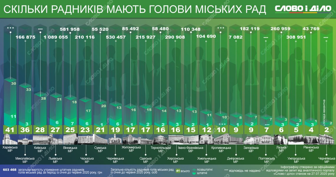 Лидерами по количеству советников стали городские головы Харькова - 41 человек, Николаева - 36 человек и Киева - 28 человек. А меньше всего советников у мэров Чернигова (2), Ровно (4) и Ужгорода (5).