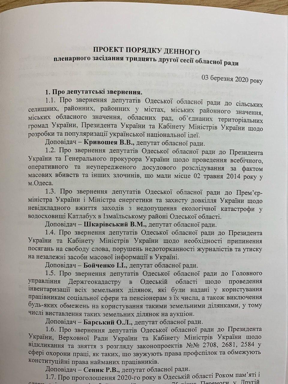 Позже стало известно, что во время совещания, которое перед началом сессии провел глава Одесского облсовета Сергей Паращенко, его первый заместитель Вадим Шкаровский, который выступал одним из авторов проекта, отозвал документ.