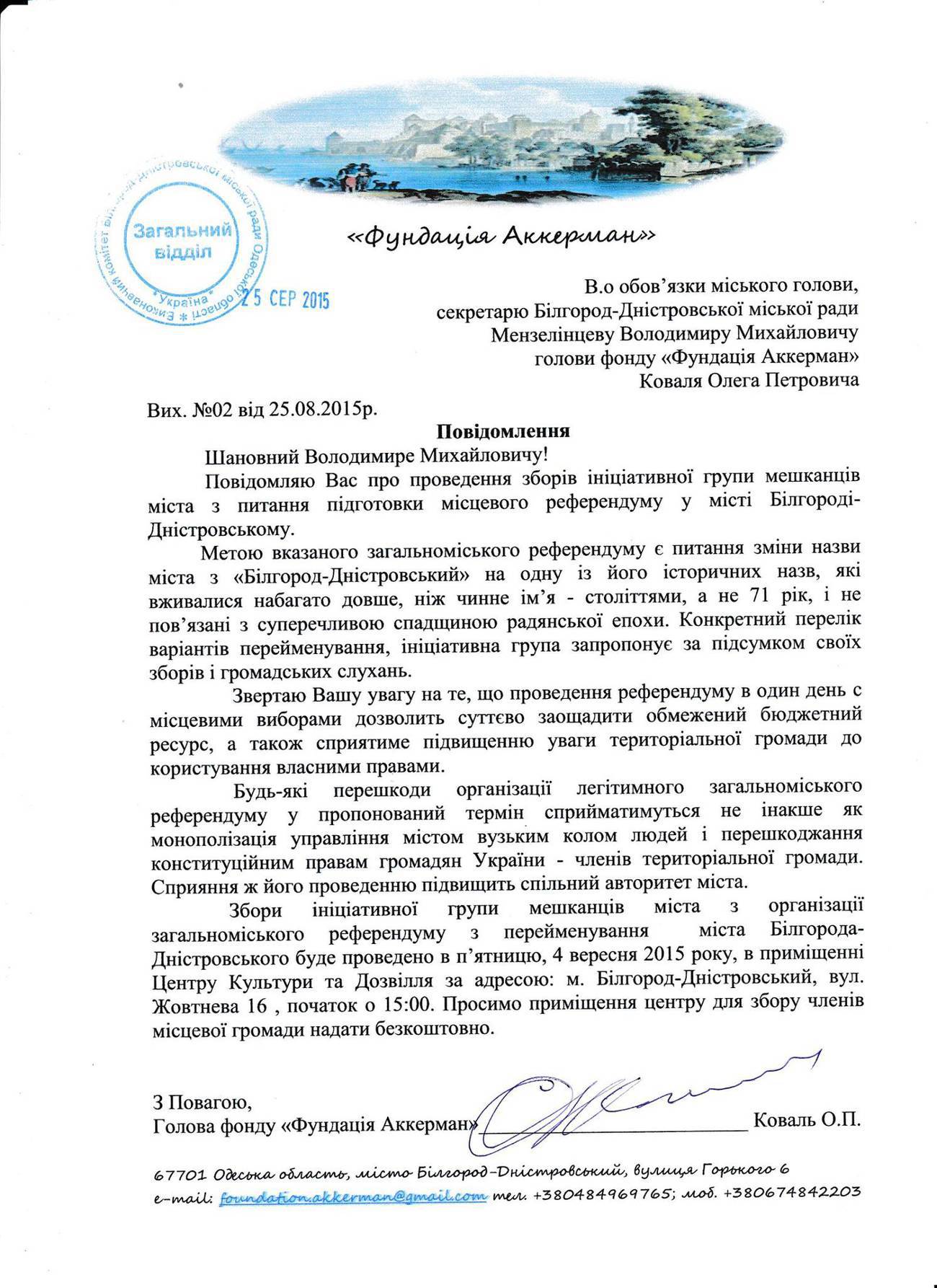 Соответствующее уведомление было направлено и.о. городского головы Белгорода-Днестровского Владимиру Мензелинцеву от фонда «Фундацiя Аккерман».
