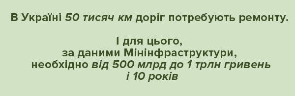 Первый источник традиционное - госбюджет. ОГА предложила Кабмину и «Укравтодора» собственные расчеты. Она планирует получить из госбюджета 500 млн грн, что составляет около 15% от общей суммы.