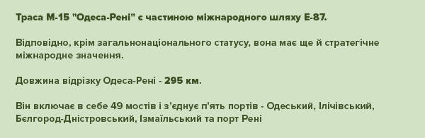 Второй проект. Сейчас транспортный отдел Одесской облгосадминистрации сосредоточился на втором варианте - это более реальная цель. Речь идет о масштабном реконструкционном проекте существующей дороги М-15 «Одесса-Рени». Однако и здесь не все просто.