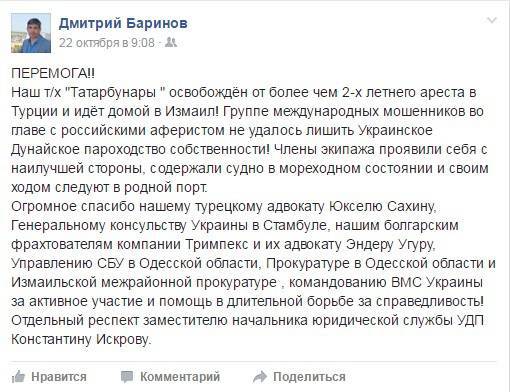 «Наш теплоход «Татарбунары» освобожден от, более чем двухлетнего ареста в Турции и идет домой в Измаил! Группе международных мошенников во главе с российским аферистом не удалось лишить УДП собственности! Члены экипажа проявили себя с наилучшей стороны, содержали судно в мореходном состоянии и своим ходом следуют в родной порт», - написал он.