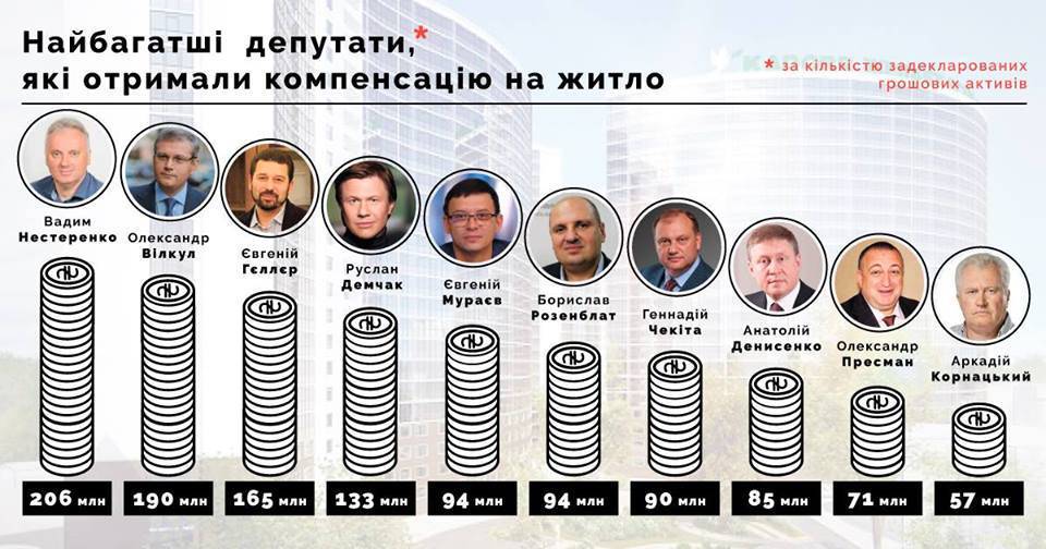 Десятка самых депутатов, которые получали компенсации на жилье выглядит так: на первом месте Вадим Нестеренко, задекларировавший в общей сложности 206 млн грн, на втором Александр Вилкул - 190 млн грн, третье место - Евгений Геллер 165 млн грн, четвертое - Руслан Демчак, 133 млн грн, пятое - Евгений Мураев, 94 млн грн и шестое - Борислав Розенблат, 94 млн грн.
