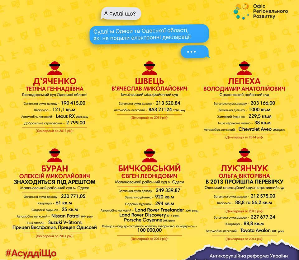 Кроме того, "Офис регионального развития" сообщает, что активисты выявили шесть судей в Одесской области, которые вообще не подали электронные декларации. По этому поводу в НАПК также направлено соответствующее обращение.