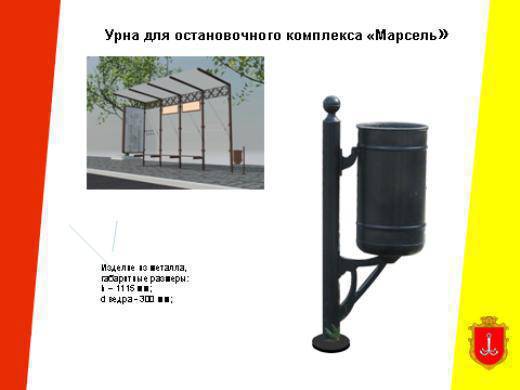 По его словам, дизайн урн разрабатывался с учетом внешнего вида остановочных комплексов «Марсель», «Модуль» и «Отрада», архитектурные типы которых были утверждены решениями исполкома Одесского городского совета от 26 февраля 2015 года.