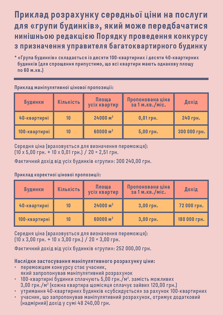 Кроме того, положения Порядка по определению победителя конкурса по группе домов содержат коррупциогенные нормы, позволяющие одержать победу участнику конкурса, который предлагает не выгодную для конкретного дома цену. Так, п.6 раздела IV Порядка предусматривает оценивание конкурсного предложения в части цены по средней цене для группы домов.
