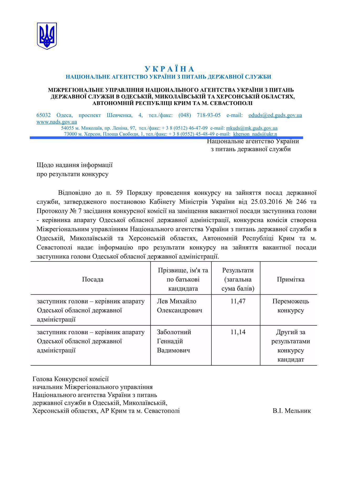 Победителем конкурса на замещение вакантной должности заместителя председателя Одесской облгосадминистрации - руководителея аппарата стал Михаил Лев. Соответствующие результаты конкурса обнародовало Национальное агентство по вопросам государственной службы.