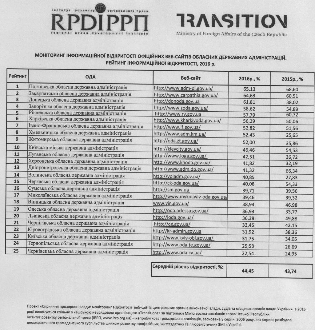 Институт развития региональной прессы презентовал результаты мониторинга открытости веб-сайтов областных государственных администраций и рейтинг информационной открытости.