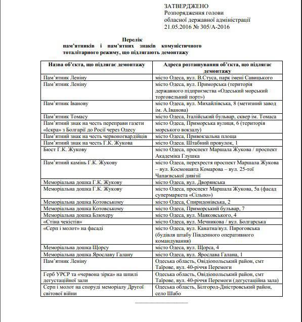 Также губернатор распорядился демонтировать ряд одесских памятников — двух оставшихся Лениных (того, что в парке Савицого, и расположенного на территории бывшего судоремонтного завода), мемориальных досок и бюста Жукову, памятники Иванову, Томасу, памятные знаки в честь красногвардейцев и газеты «Искра», мемориальные доски Котовскому, Блюхеру, Щорсу, Галану. Кроме того, фасад штаба Южного оперативного командования лишится серпов и молотов, а угол Мечникова и Болгарской — «стены чекистов».