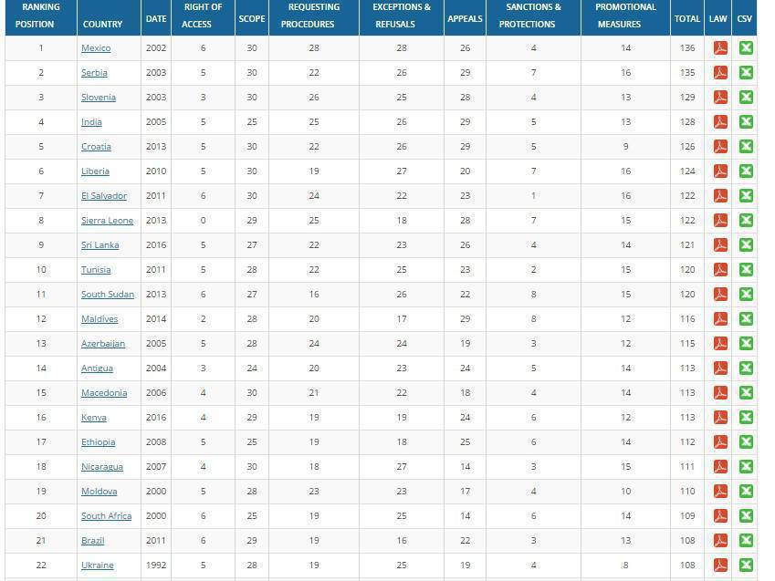 Украинское законодательство о доступе к информации заняло 22 позицию из 111 стран мира в Международном рейтинге обеспечения права на информацию.