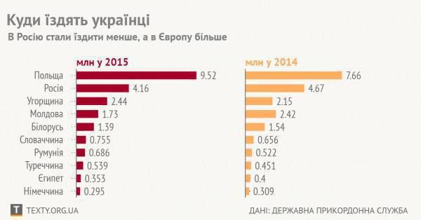 Россия остается на втором месте среди стран, которые посещали украинцы, но если в 2014 году туда съездили 4 миллиона 670 тысяч человек, то в 2015 году уже 4 миллиона 160 тысяч. То есть, количество украинцев, съездивших в Россию, снизилось на 500 тысяч человек.