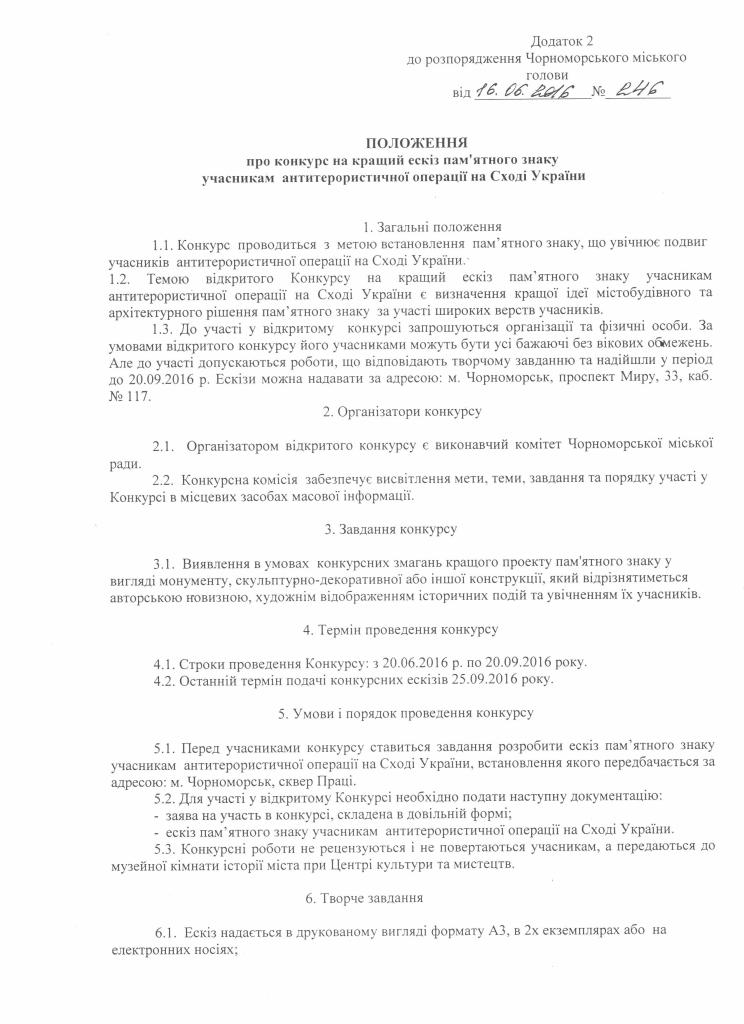 Как следует из распоряжения городского головы Черноморска Валерия Хмельнюка сроки проведения конкурса на лучший эскиз памятного знака участникам антитеррористической операции на востоке Украины с 7 декабря 2016 года по 7 марта 2017 года.