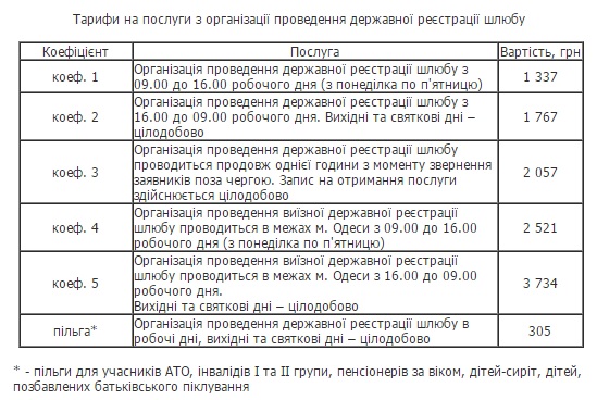 Самой дорогой услугой станет организация проведения выездной государственной регистрации брака в пределах Одессы с 16:00 до 09:00 рабочего дня, а в выходные и праздничные дни – круглосуточно – 3734 грн.
