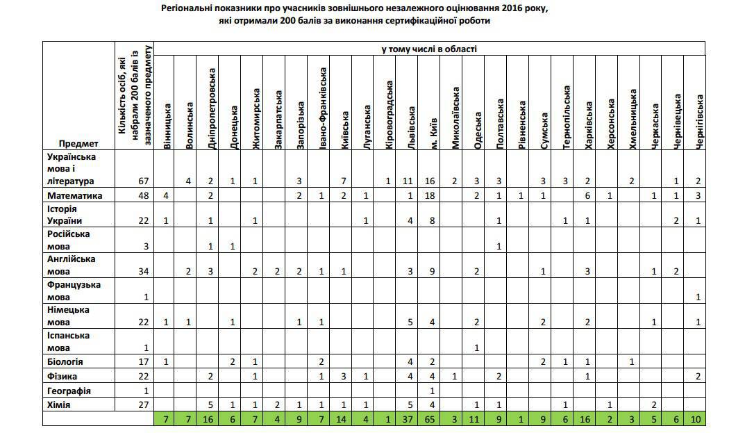 Лидерами по количеству выпускников, набравших 200 баллов, стали Киев, и Львовская область. В Киеве набрали по 200 баллов 65 выпускников, а в Львовской области – 37. В Днепропетровской и Харьковской областях набрали по 200 баллов 16 человек в каждом регионе. В Киевской области высшие баллы набрали 14 человек, а в Черниговской – 10.
