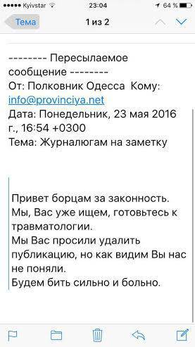 Как ИМИ рассказал главный редактор «Провинции» Евгений Кифоренко, злоумышленники требуют удалить новость про коррупцию в воинской части в Одессе, которую журналисты опубликовали на сайте своего издания 20 мая. По словам Евгения Кифаренко в течение 2 дней сайт издания атаковали хакеры, а на электронную почту редакции поступали письма с угрозой физической расправы с разных электронных адресов.
