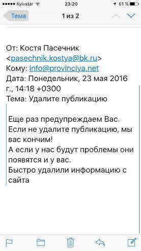 Как ИМИ рассказал главный редактор «Провинции» Евгений Кифоренко, злоумышленники требуют удалить новость про коррупцию в воинской части в Одессе, которую журналисты опубликовали на сайте своего издания 20 мая. По словам Евгения Кифаренко в течение 2 дней сайт издания атаковали хакеры, а на электронную почту редакции поступали письма с угрозой физической расправы с разных электронных адресов.