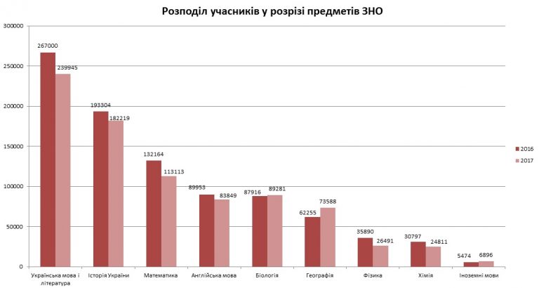 Наиболее популярным учебным предметом для прохождения внешнего независимого оценивания, кроме украинского языка стала история Украины - этот тест будут сдавать 71,72% от общего количества зарегистрированных выпускников текущего года. Математику планируют сдавать 40,23%, биология популярна у 28 , 88%, английский язык - 25,9%. Лишь 6,55% выпускников будут проходить государственную итоговую аттестацию в форме внешнего независимого оценивания по физике и химии - 2,49%.