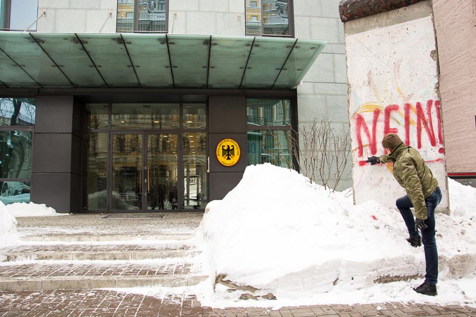 Народный депутат Украины Алексей Гончаренко заявил, что на обломке Берлинской стены возле посольства Федеративной республики Германии в Киеве написал слово «NEIN»