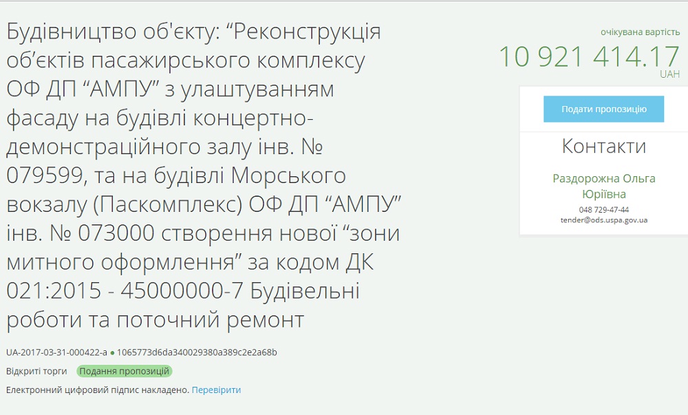 По данным АМПУ, за работу предлагается 10 миллионов 921 тысячу 414 гривень.