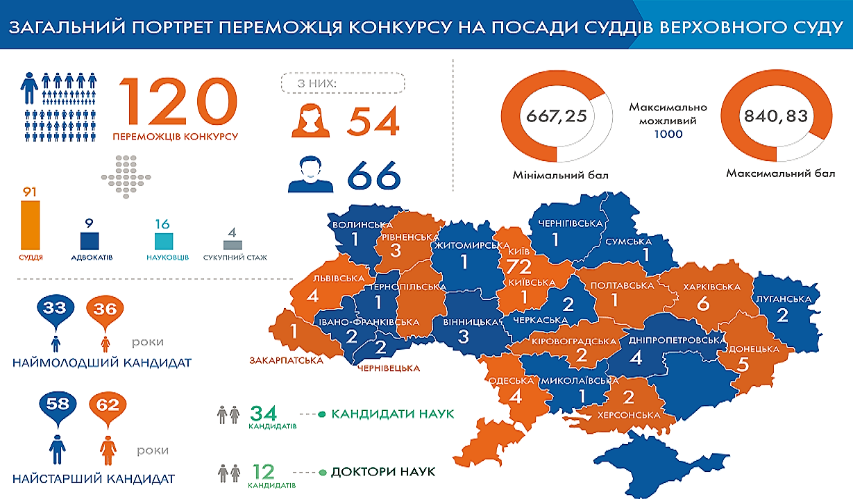 В целом до финала дошли 320 кандидатов. Так, за 30 мест в Кассационном гражданском суде Верховного Суда соревновались 99 кандидатов, в Кассационном административном — 55, Кассационном хозяйственном — 71, Кассационном уголовном — 95.