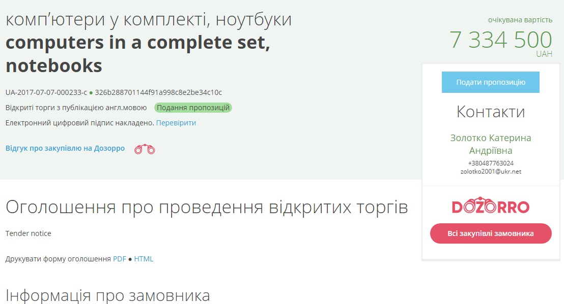 Общая сумма компьютеров, которые департамент планирует закупить — 617. Таким образом, один компьютер будет стоить 11 тысяч 887 гривень.