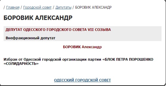 Напомним также, что А. Боровик был первым номером в избирательном списке партии "БПП «Солидарность» на выборах в городской совет Одессы.