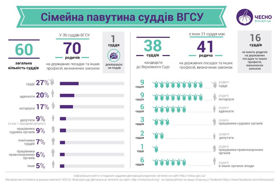 Общественное движение ЧЕСНО в рамках проекта «Фильтруй суд» отмечает, что судьи высших судов за период пребывания на своих должностях «сохранили традицию строить династии как в системе, так и вне ее».