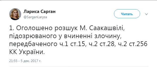 По ее словам, политика подозревают в совершении преступлений, предусмотренных тремя статьями уголовного кодекса Украины. В тоже время в ориентировке, распространенной Национальной полицией Украины указано подозрение только по статье 256 «Содействие участникам преступных организаций и сокрытие их преступной деятельности».