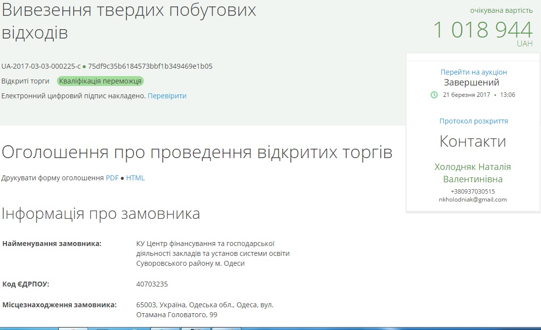 Коммунальное учреждение «Центр финансирования и хозяйственной деятельности учреждений и учреждений системы образования Суворовского района Одессы» планирует заключить договор с ООО «Эко-Ренессанс» о вывозе и складировании твердых бытовых отходов.
