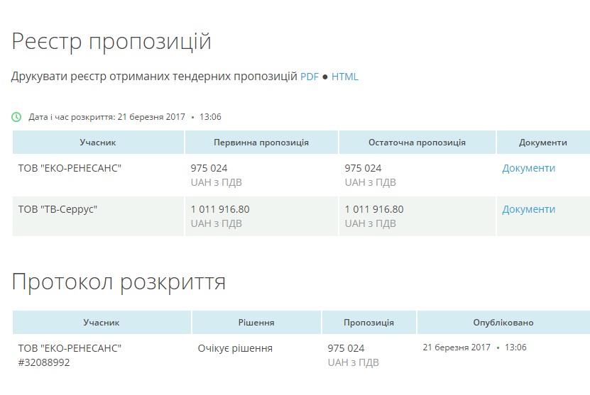 Конкурентом «Эко-Ренессанса» выступила компания ООО «ТВ Серрус», которая соглашалась проделать ту же работу за 1 миллион 11 тысяч 916 гривень.