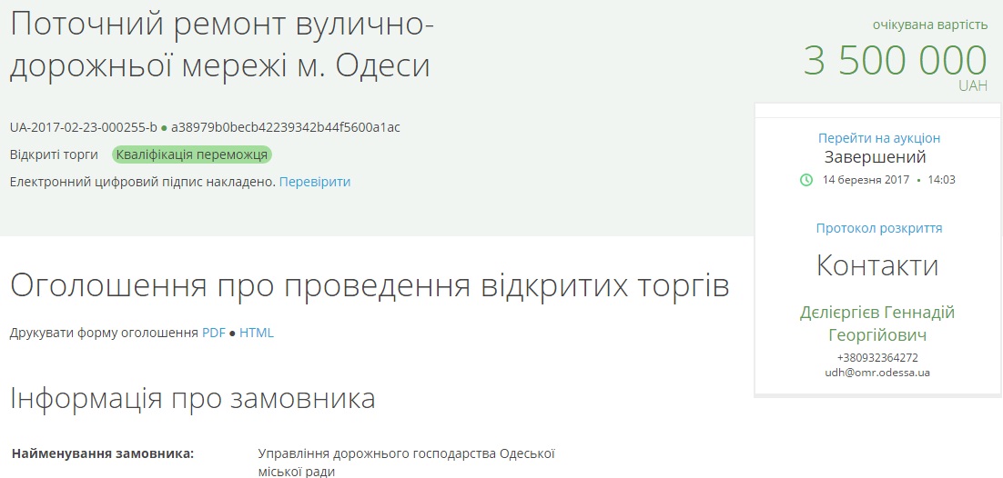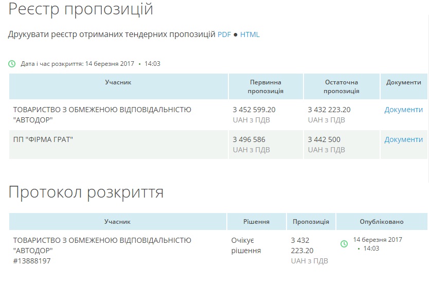 На сегодняшний день торги находятся на стадии «квалификация победителя», и управление планирует заключить договор с ООО «Автодор». Компания согласилась предоставить требуемые услуги за 3 миллиона 432 тысячи 223 тысячи, а «Фирма Грат» готова была работать за 3 миллиона 442,5 тысяч гривень. Ожидаемая стоимость закупок была 3 миллиона 500 тысяч гривень. Торги состоялись 14 марта. Площадь покрытия, подлежащего текущему ремонту, составляет 5 тысяч 904 квадратных метра.