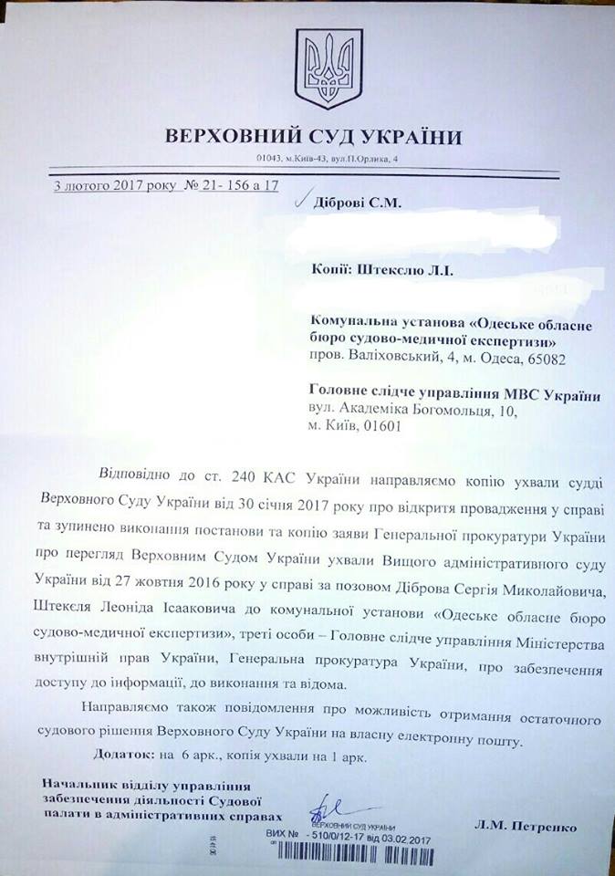 Генеральная прокуратура Украины обжаловала в Верховном Суде решения трех админсудов — окружного, апелляционного и Высшего — по иску участников «группы 2 мая», журналистов Леонида Штекеля и Сергея Диброва, которые требуют обнародовать копии заключений судебно-медицинских экспертов, исследовавших тела погибших в одесской трагедии 2014 года.