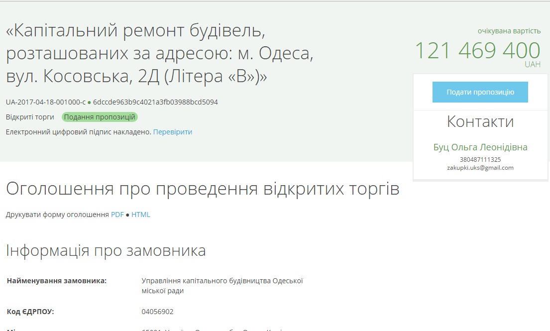 Ранее 31 марта Управление капитального строительства провело конкурс по выбору компании, которая проведет капитальный ремонт здания нежилого помещения, расположенного по адресу: г. Одесса, ул. Косовская, 2-Д. По данным системы, наименьшую цену за свои услуги предложило частное предприятие «Добробуд-Град», которое согласилось провести капитальный ремонт в здании «новой мэрии» за 82 миллиона 680 тысяч, то есть на 8 миллионов 973 тысячи 500 гривень дешевле ожидаемой стоимости закупки. Согласно Единому реестру юридических лиц, физических лиц-предпринимателей и общественных формирований, основателем частного предприятия «Добробуд-Град» является Михаил Жученко, а руководителем — Игорь Касаткин, на которого, согласно данным сервиса «youcontrol», зарегистрированы еще два предприятия: частное предприятие «Капитель» и частное предприятие «Европейский центр интернет-проектирования и телекомьютинга», деятельность которого прекращена в 2016 году. Отметим, что последнее через учредителя Татьяну Кушнер связано с еще рядом фирм и зарегистрировано было в Севастополе. Кроме того, одна из связанных фирм — ЧП "Компания «Евролайн» в учредителях указывала некоего Константина Игоревича Гришина — полного тезку народного депутата, который позже сменил свое имя на Семена Семенченко.