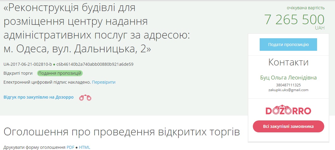 Речь шла о процедуре открытых торгов по предмету закупки — капитальный ремонт и реставрация здания, расположенного по адресу Одесса, улица Академика Королева, 9 с размещением центра предоставления социальных услуг в формате «Прозрачный офис».