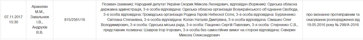 Напомним, что свой иск Н. Скорик подал более года назад, еще весной 2016-го. Он требует признать протиправним и отменить распоряжение М. Саакашвили от 19 мая 2016 года №298/А-2016 о переименовании населенных пунктов Одесской области в части переименований улиц Одессы. Николай Скорик заявил, что ряд улиц, в частности, Белинского, Гайдара, Валентины Терешковой, Героев Сталинграда, Правды, проспект Маршала Жукова не соответствуют критериям закона о декоммунизации, а значит, менять их название не надо. Впрочем, как известно, Одесская мэрия, в которой сначала тоже заявляли, что распоряжение экс-главы ОГА является незаконным, уже активно использует новые названия в своих документах и информационных сообщениях: