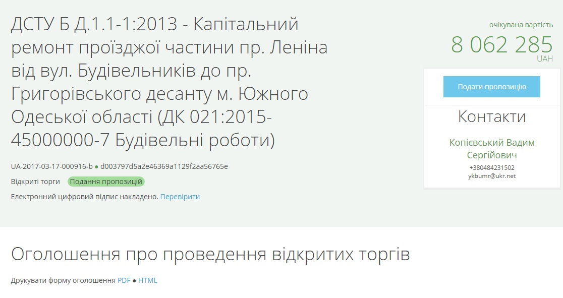 Управление капитального строительства Южненского городского совета объявило тендер для определения компании, которая сделает капитальный ремонт проспекта Ленина в этом городе, переименованного в проспект Мира.