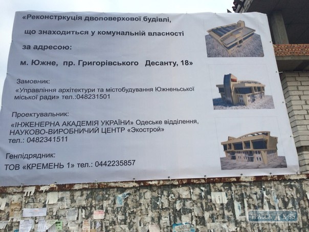 В здании планируется разместить городской совет однако, по данным СМИ, компания «Санта-Юг», осуществлявшая строительство здания мэрии Южного, разорвала контракт на строительство. Рабочие покинули территорию недостроенного объекта. Причиной разрыва между мэрией Южного и строительной компанией, принадлежащей, кстати, экс-депутату облсовета Александру Зелинскому, стала, якобы, задолженность мэрии по оплате труда строителей: якобы бюджет Южного уже должен им более 400 тысяч гривен. Строительство нового здания мэрии возобновилось в Южном Одесской области в 2015 году .