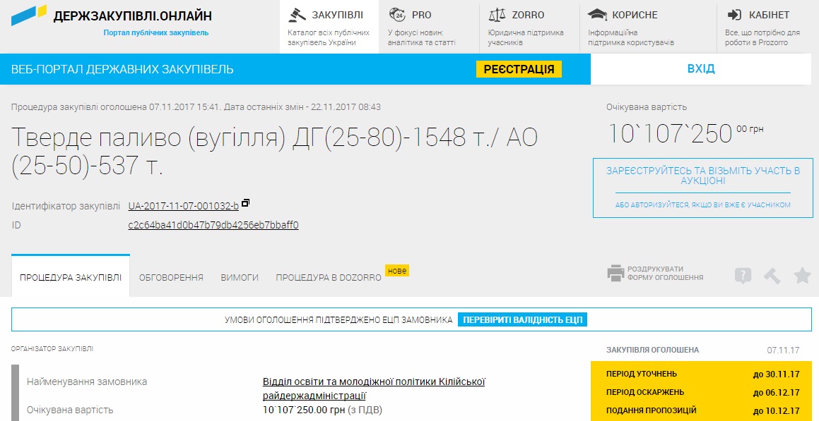 Напомним, отдел образования и молодежной политики Килийского райгосадминистрации Одесской области 3 октября по результатам тендера заказал ЧАО «Производственное объединение «Облтопливо» угля на 2 миллиона 830 тысяч гривень.
