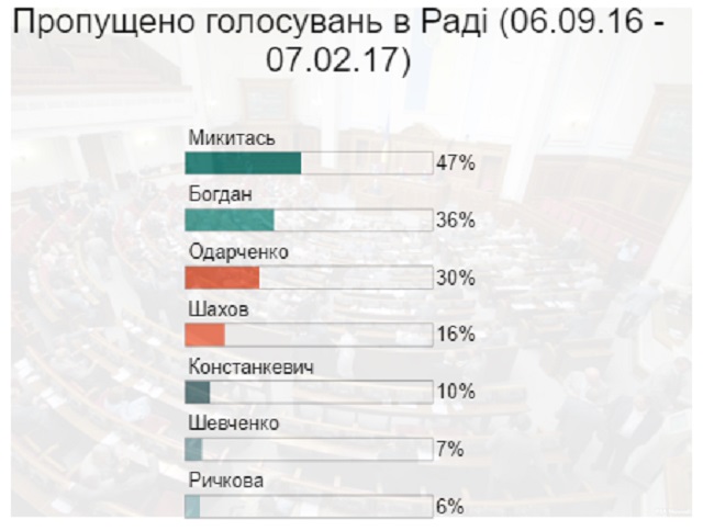 Эффективно себя проявили внефракционные депутаты Виктор Шевченко (ОВО №85, Ивано-Франковская область) и Ирина Констанкевич (ОВО №23, Волынская обл.), а также Татьяна Рычкова (ОВО №27, Днепропетровская обл.) из фракции Блока Петра Порошенко.