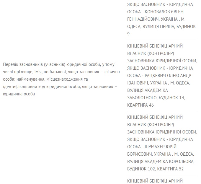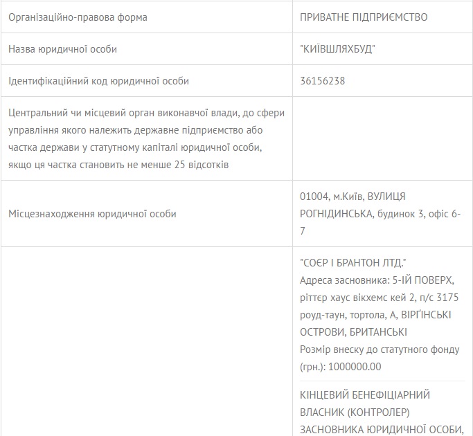 Согласно единому реестру юридических лиц, физических лиц-предпринимателей и общественных формирований, конечными бенефициарами ЧП «Киевшляхбуд» являются «Соер и Брантон ЛТД» зарегистрированная на Виргинских островах, а также Юрий Шумахер, Александр Рацкевич, Евгений Коновалов и житель Лондона Александр Жуков. Эти же люди числятся конечными бенефициарами ООО «Ростдорстрой». Юрий Шумахер является депутатом Одесского городского совета от партии «Доверяй делам» Геннадия Труханова.