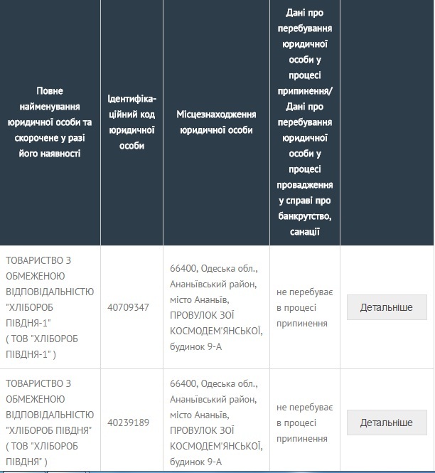 Согласно данным Единого реестра юридических лиц, физических лиц-предпринимателей, ООО «Хлибороб Пивдень» зарегистрировано по адресу: г. Ананьев, улица Зои Космодемьянской, 9-А. Основателем этого ООО является компания «Конти 7», зарегистрированная в Бельгии, а директором является Геннадий Фомичев. Дата записи в Едином государственном реестре о проведении государственной регистрации юридического лица значится 28 января 2016 года. По этому же адресу в Ананьеве зарегистрировано ООО «Хлибороб Пивдня 1», его основателями являются Дмитрий Билобровенко, Денис Касьян и Вадим Чернов. Директором является Сергей Лобунец. Датой регистрации этого ООО значится 2 августа 2016 года.