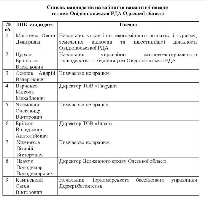 Место главы Овидиопольской РГА желают занять девять человек, среди которых – директор Государственного архива Одесской области Владимир Левчук, начальник Черноморского бассейнового управления Госрыбагентства Евгений Каминский, два директора обществ с ограниченной ответственностью Владимир Брилев и Николай Варченко, временно безработные Александр Якимович, Виталий Хижняков и Андрей Осипов, а также два начальника управлений Овидиопольской РГА – Ольга Маломуж и Бронислав Цуркан.