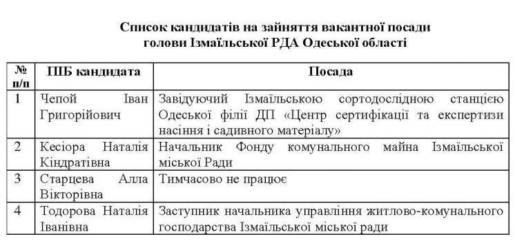 Как следует из списков, опубликованных Нацагентством, на должность в Измаильской РГА претендуют четыре человека: Иван Чепой, который занимает должность заведующего Измаильской сортоиспытательной станции Одесского филиала ГП «Центра сертификации и экспертизы семян и посадочного материала», Наталья Кесиора - начальник Фонда коммунального имущества Измаильского горсовета, Алла Старцева, ранее занимавшая должность и.о председателя Измаильской РГА, а сейчас безработная, и Наталья Тодорова— заместитель начальника управления жилищно-коммунального хозяйства Измаильского горсовета.