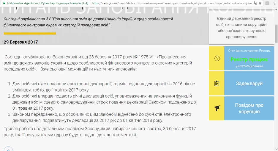 Закон Украины от 23 марта 2017 № 1975-VIII «О внесении изменений в некоторые законы Украины относительно особенностей финансового контроля отдельных категорий должностных лиц» вступил в силу сегодня 30 марта.