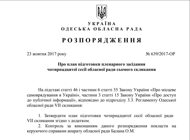 Глава Одесского областного совета Анатолий Урбанский распорядился начать подготовку к очередной сессии собрания.