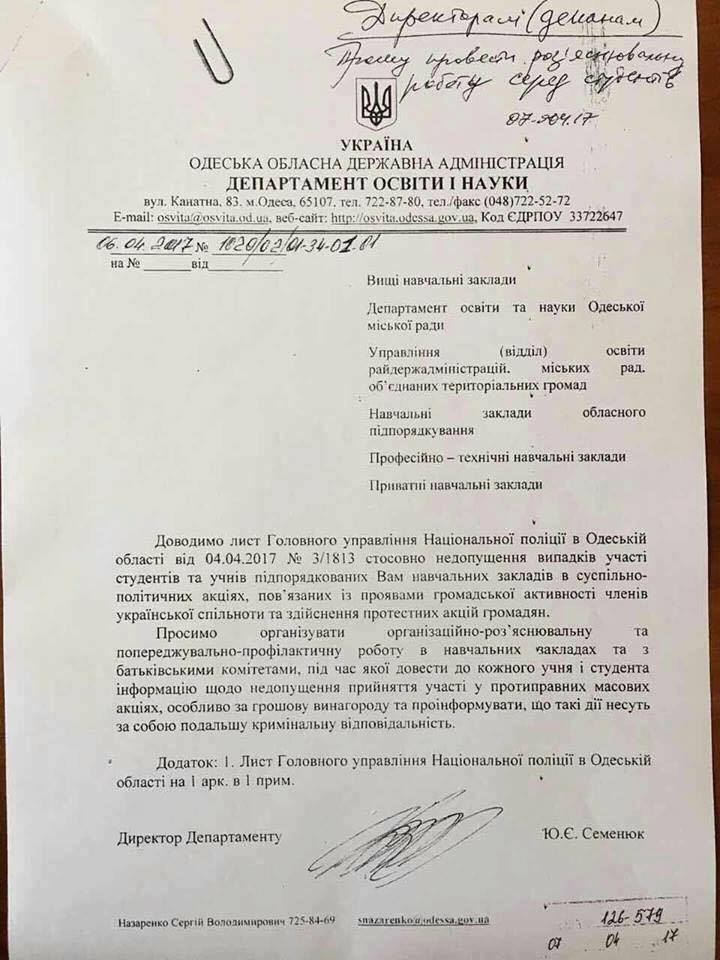 Департамент образования науки Одесской областной государственной администрации разослал директорам и деканам профессиональных технических училищ и высших учебных заведений письмо, в котором просит не допустить участия студентов в массовых акциях.