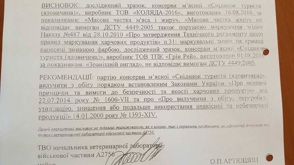 «Основной сухой суточный паек в военной части поставляется в соответствии с договором и с соблюдением процедуры тендерных торгов, а следовательно имеет все необходимые документы, и поставляется в части со складов Министерства обороны после соответствующих проверок. Сухпайки, которые часть получила по заявке командира прошли отдельно вне договора поставки, без соблюдения процедуры закупки, а просто как замена продуктов ежедневного рациона по просьбе командира данного подразделения. Поставщик предоставил эти консервы не со склада Министерства обороны, а с собственных складов», - отметили в управлении.