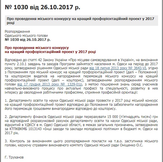 Согласно распоряжению, Департамент образования и науки Одесского городского совета должен провести в 2017 году городской конкурс на лучший профориентационный проект в соответствии и обеспечить награждение его победителей денежными вознаграждениями в соответствии со сметой.