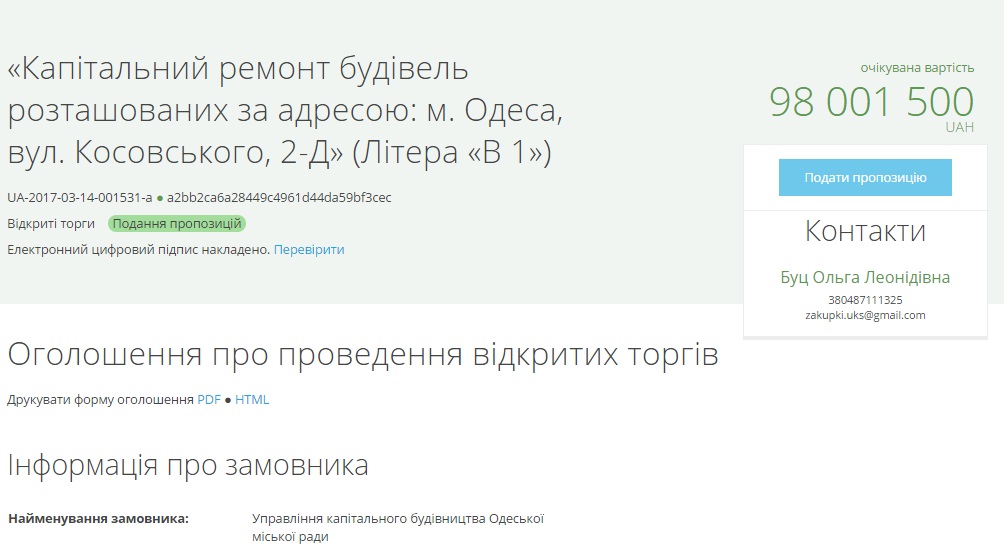 Соответствующее объявление управление разместило вчера 14 марта в системе электронных закупок Рrozorro.